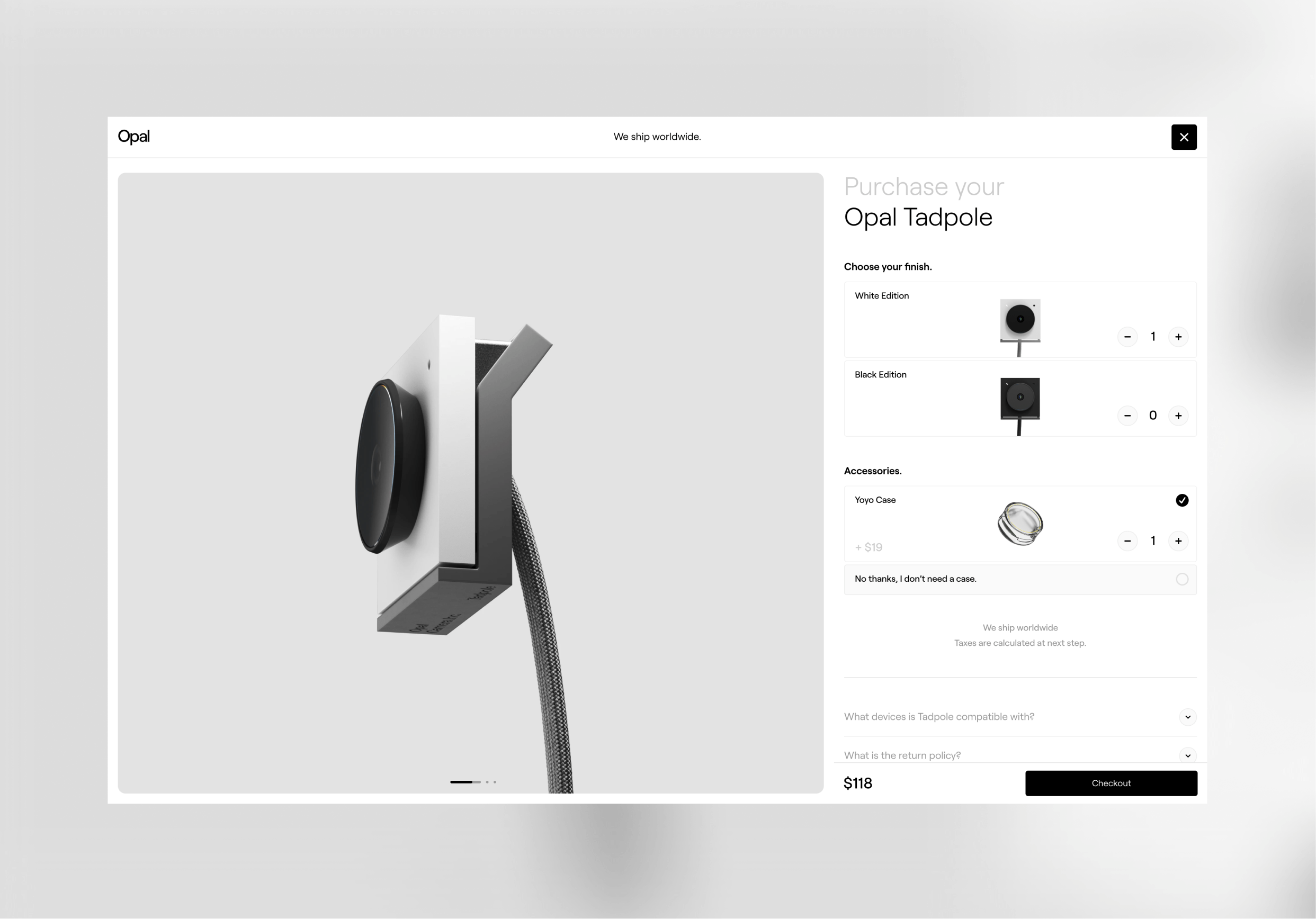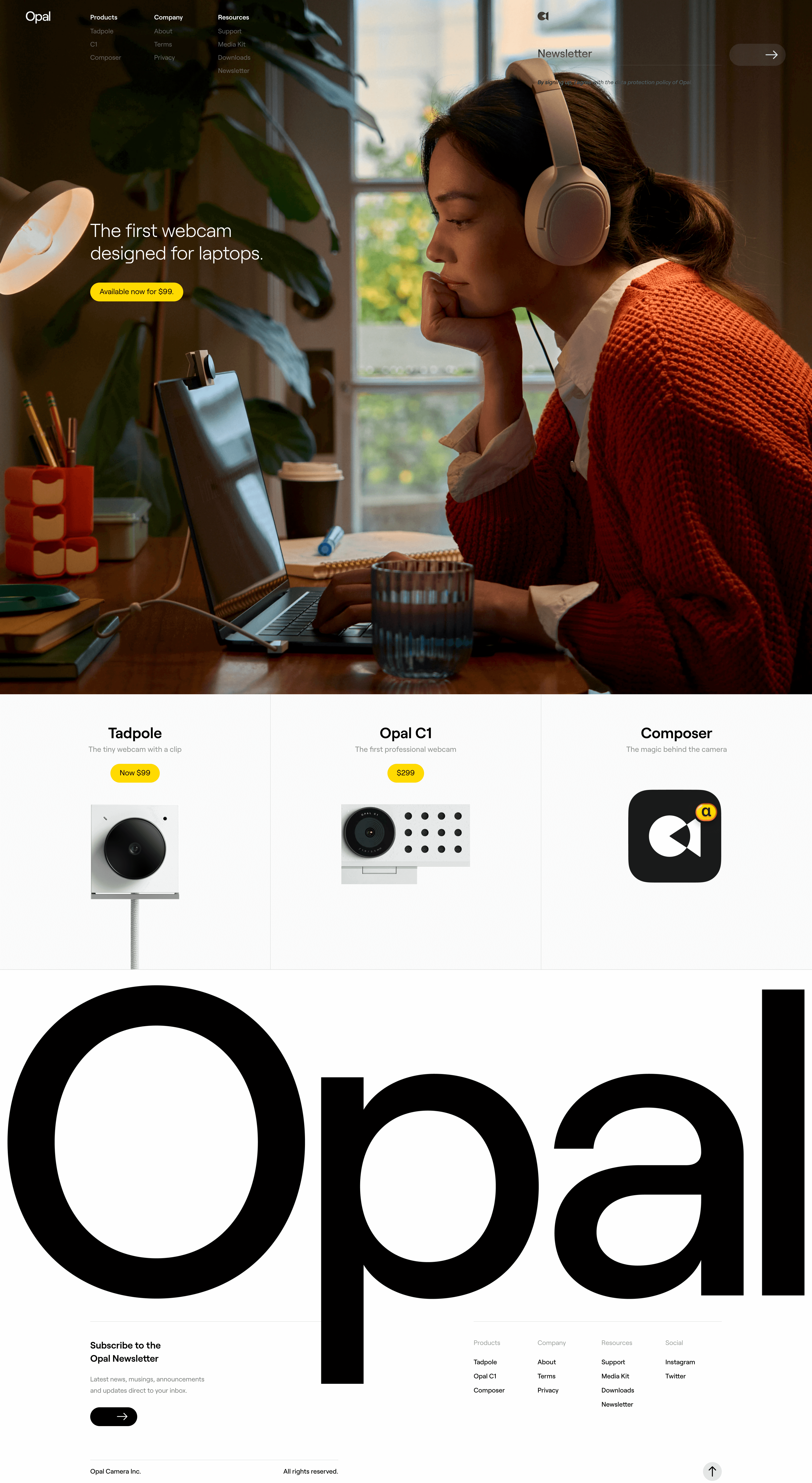 Opal Camera creates premium webcams designed to help people look and sound great during video calls. Their main products are the Opal C1, a high-quality camera ideal for desktop or home office setups, and the Tadpole, a tiny portable camera made specifically for laptops.