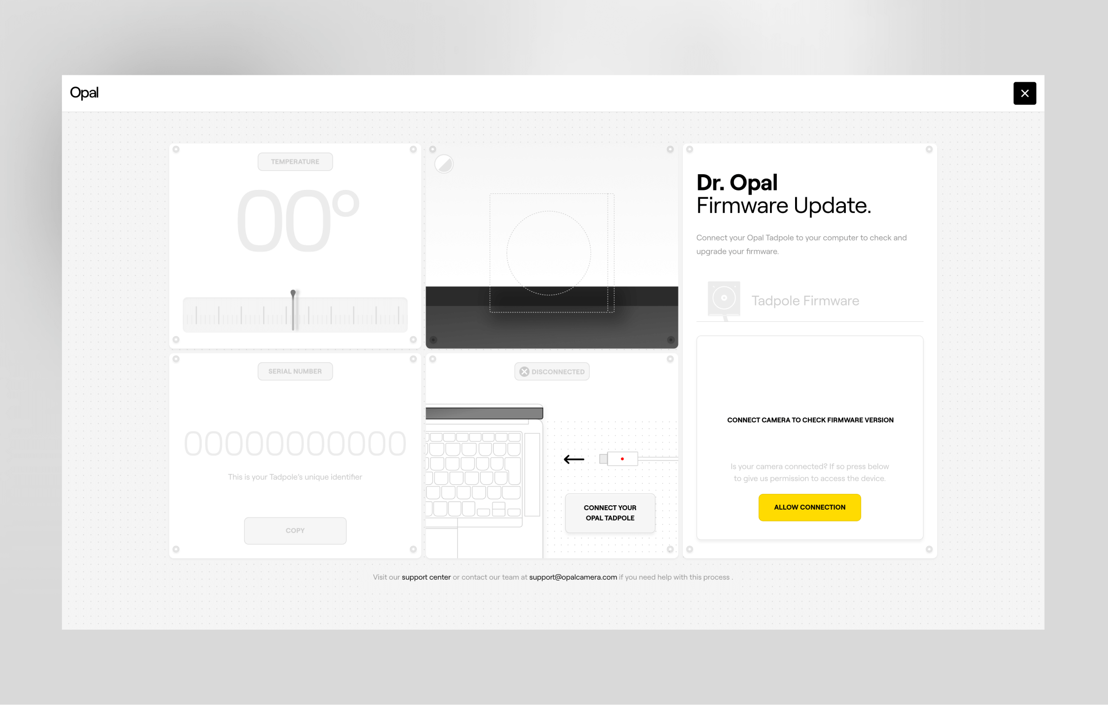 Dr. Opal is a web based tool created to help users update their Tadpole firmware. I built out the UI and collaborated with device engineers to interface it with the Tadpole.